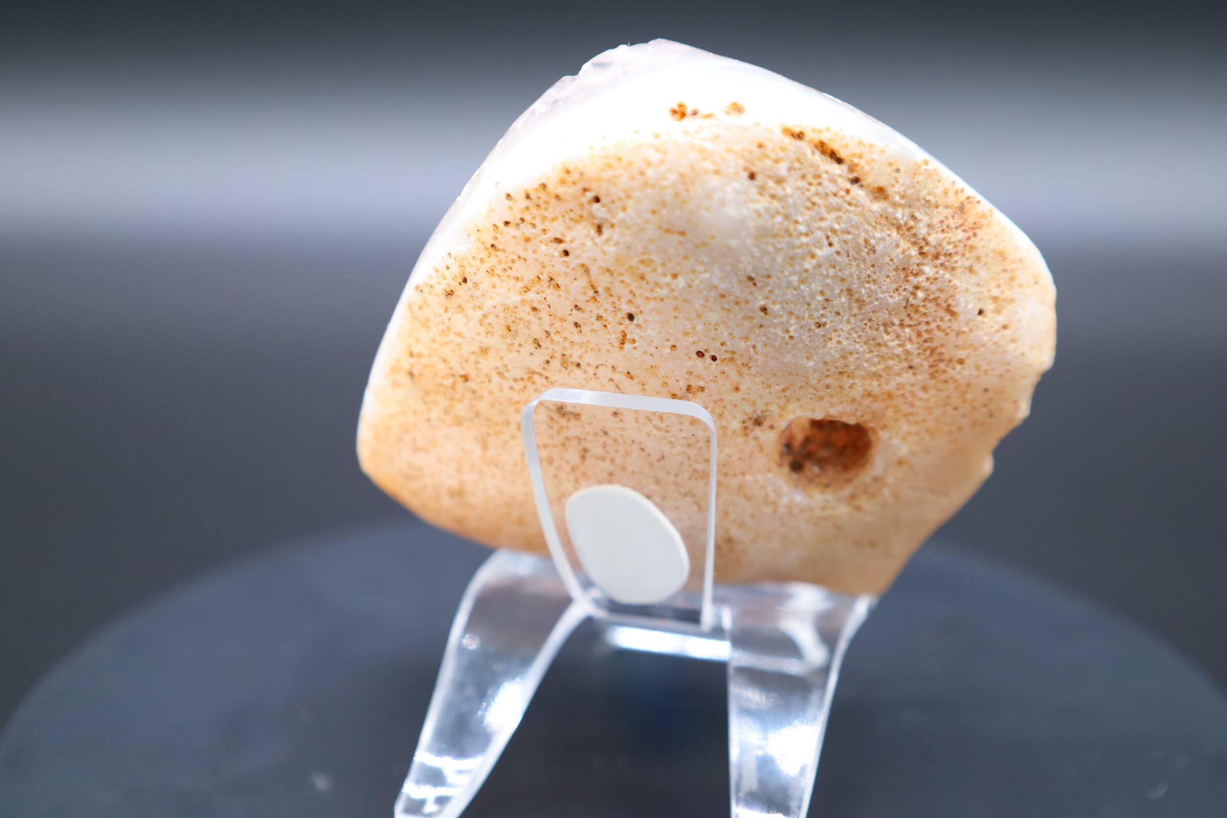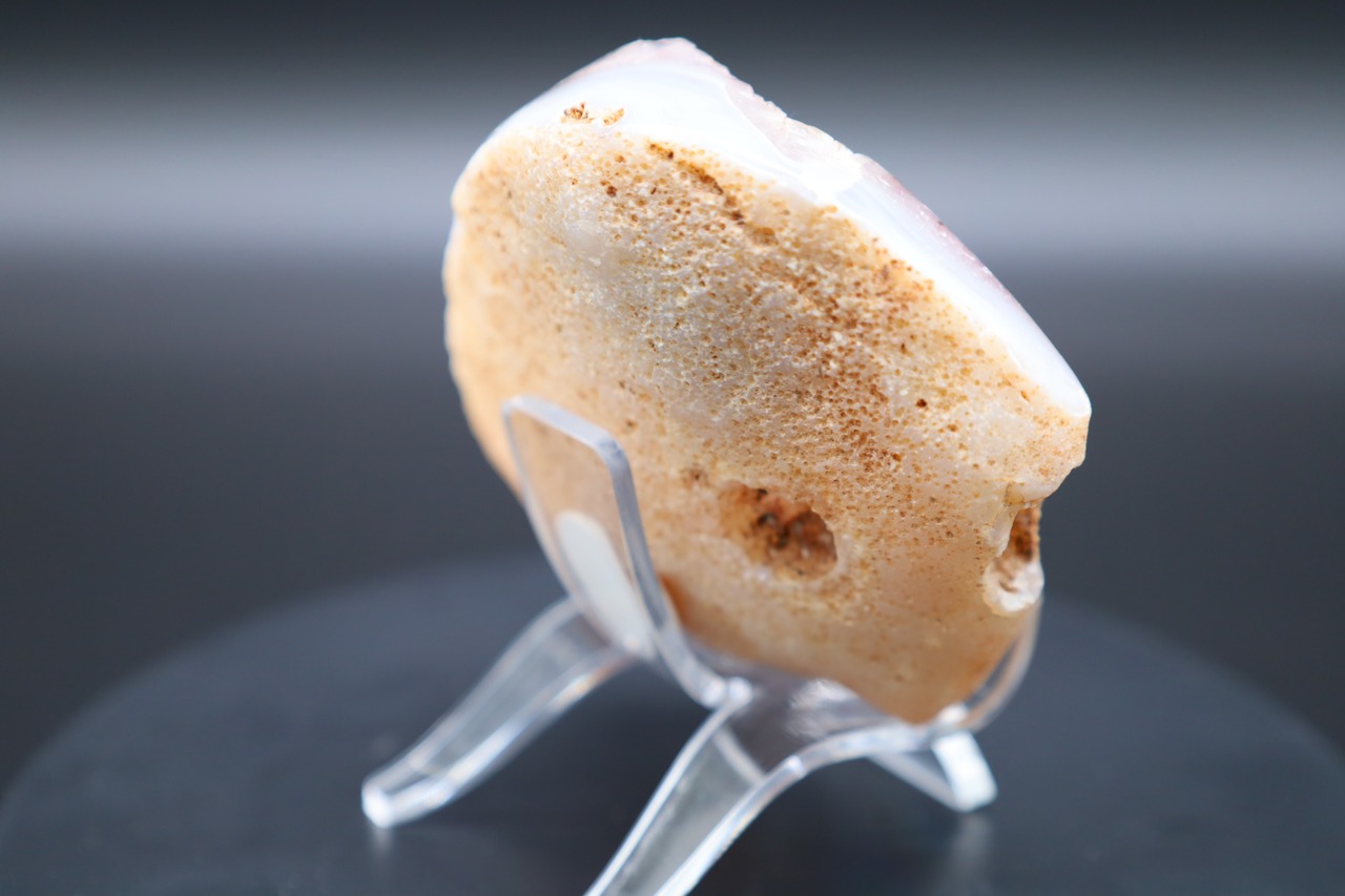 小物置きにも使えそうな瑪瑙ジオードです。写真ではピンクっぽくなっていますが、カメラの自動調整機能によるものです。正しい色彩は動画を参考にしてください。