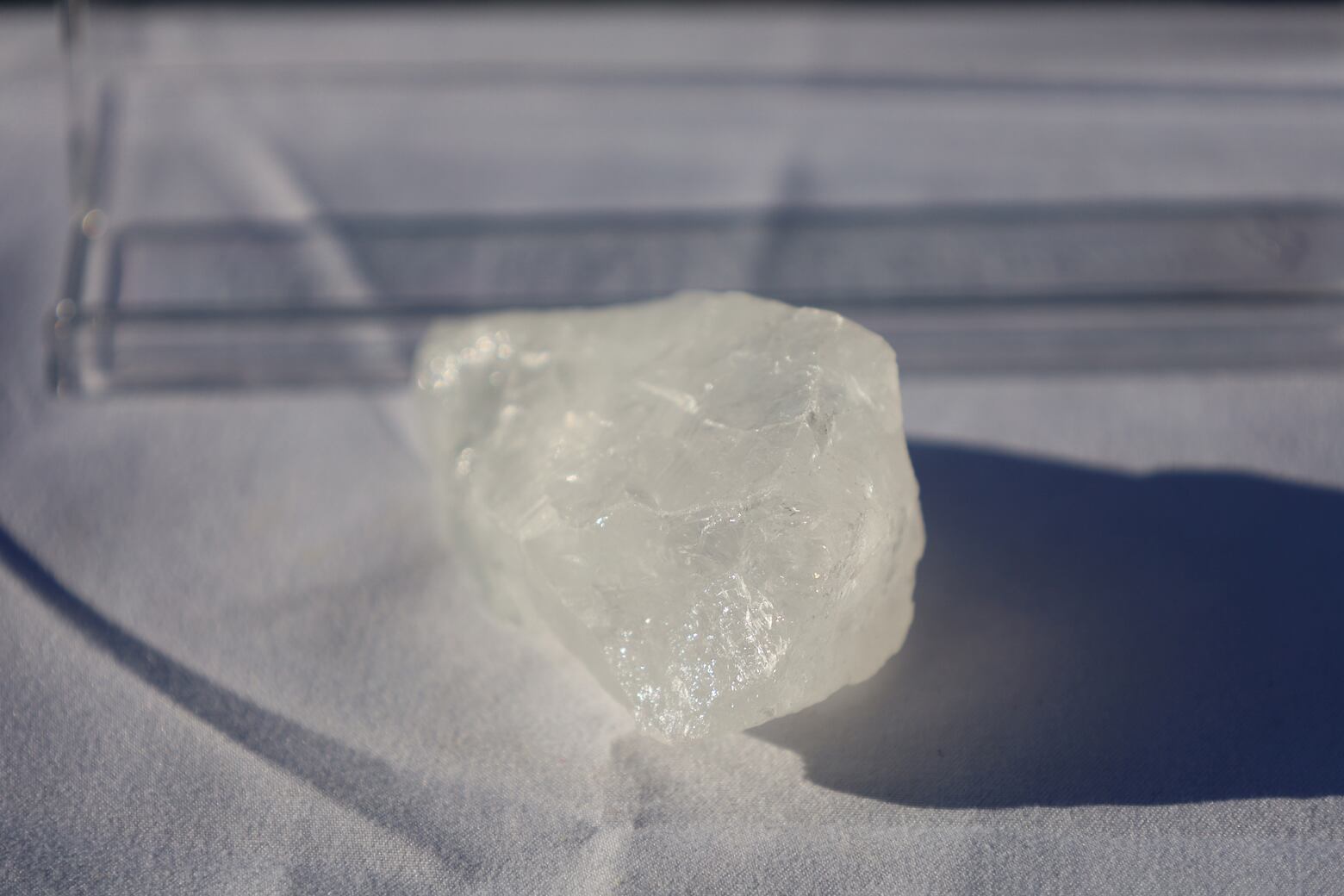 個体によってややプラシオライトっぽい色合いの入るロッククリスタルです。わずかですが側面にバーコードが見られます。