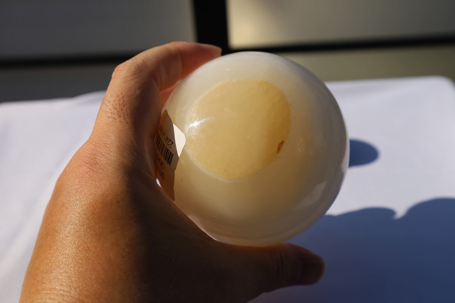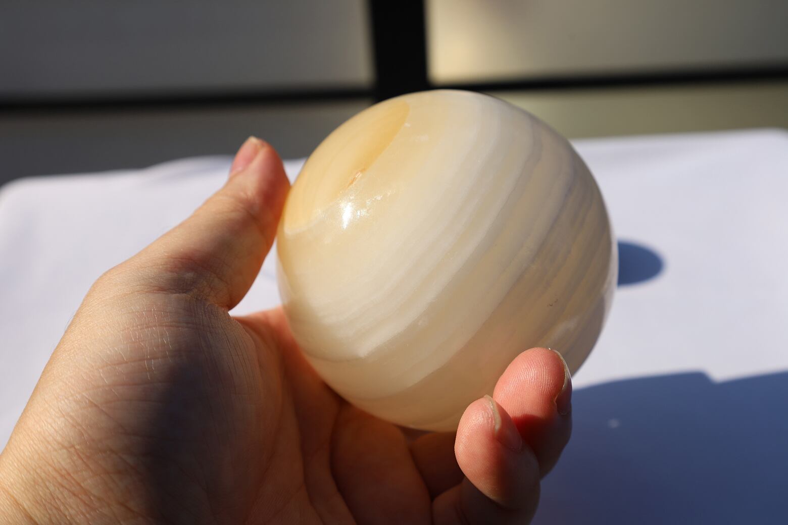 手のひら大のホワイトカルサイトスフィアです。