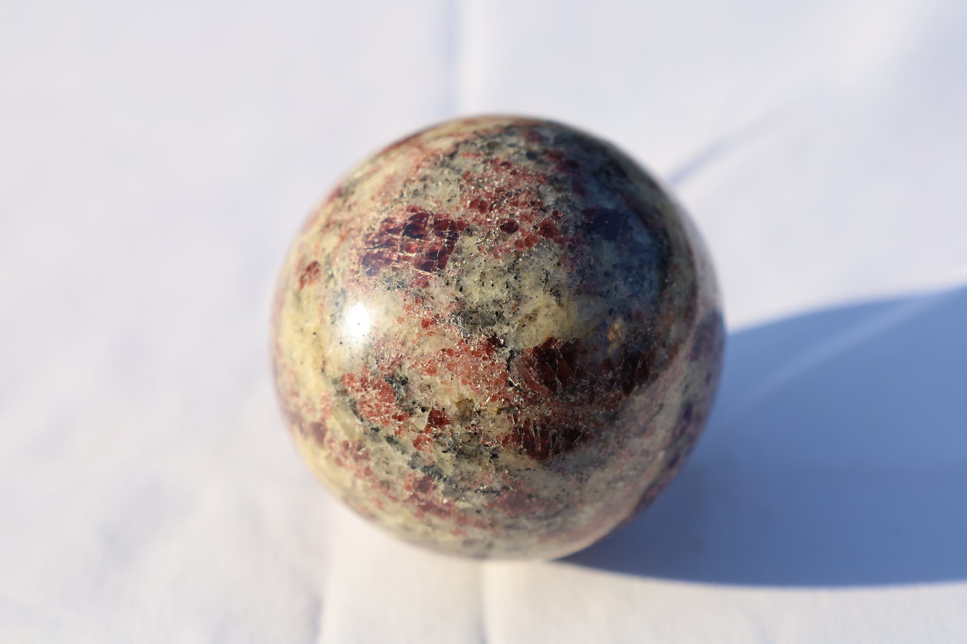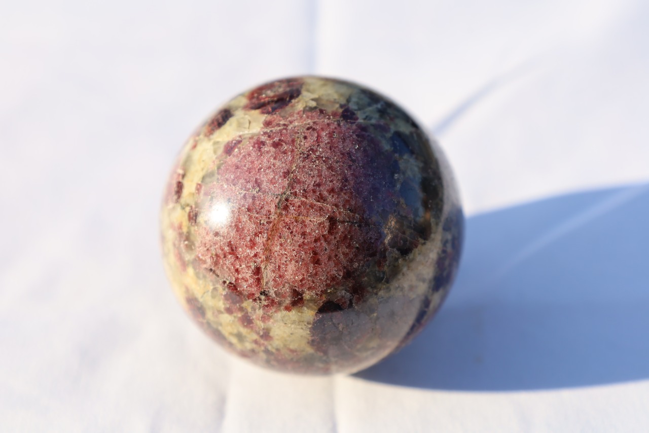白いクォーツにガーネットの赤が映えるスフィアです。