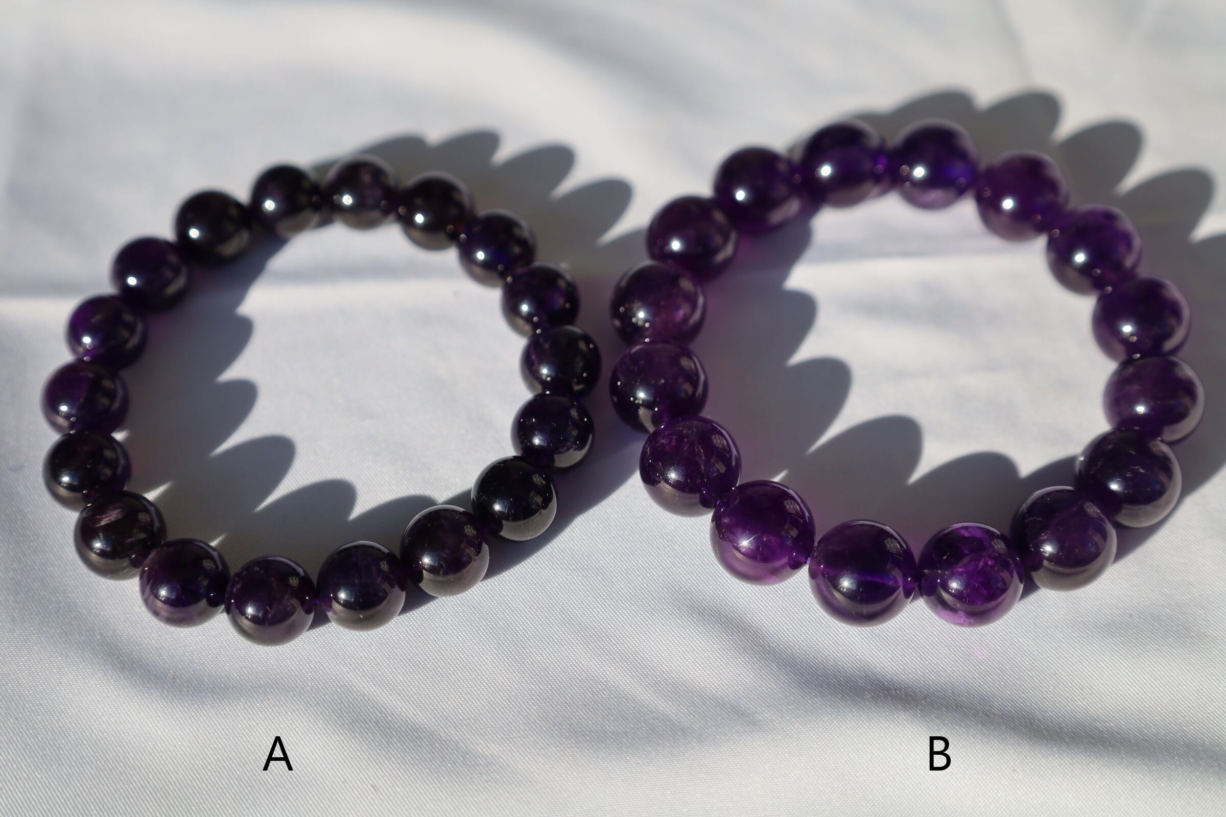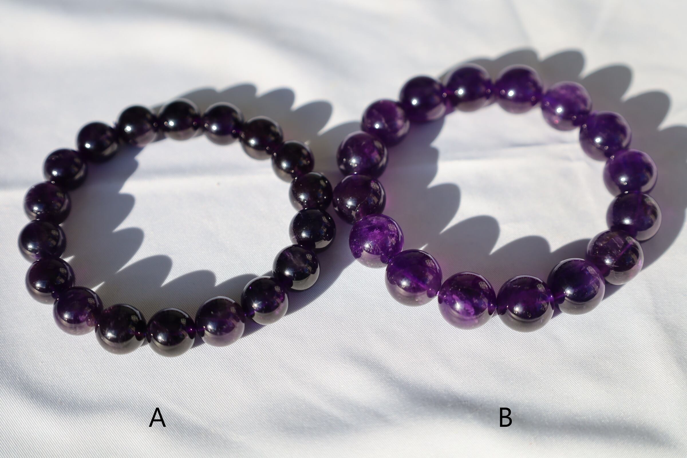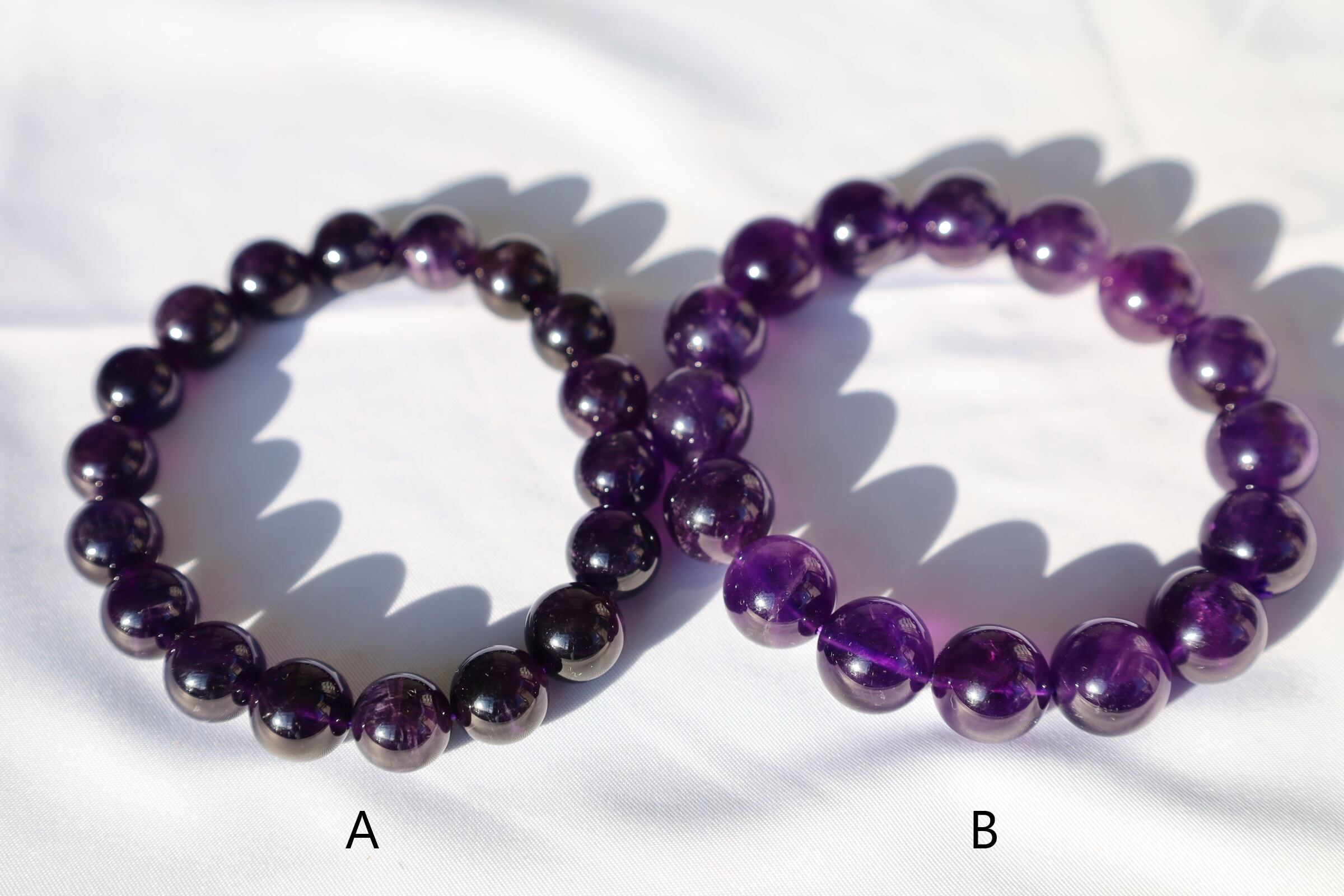 発色がよく、色が深い高品質のアメジストブレスレットです。一部、スモーキークォーツが混じる玉もございます。